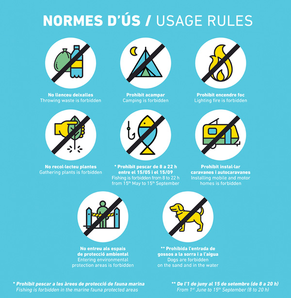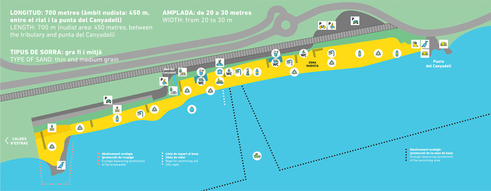 Dels 700 metres de longitud dels quals disposa, hi ha 240 metres que són d’àmbit nudista (entre el rial del Canyadell i el pas inferior).